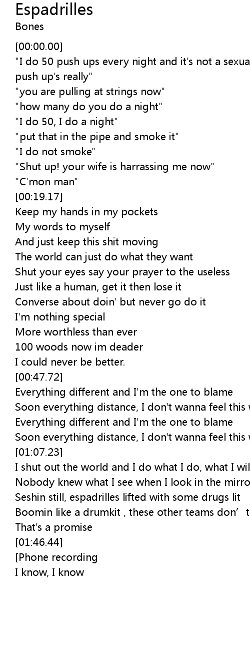 | [00:00.33] | "I do 50 push ups every night and it's not a sexual thing it's just push up's really" |