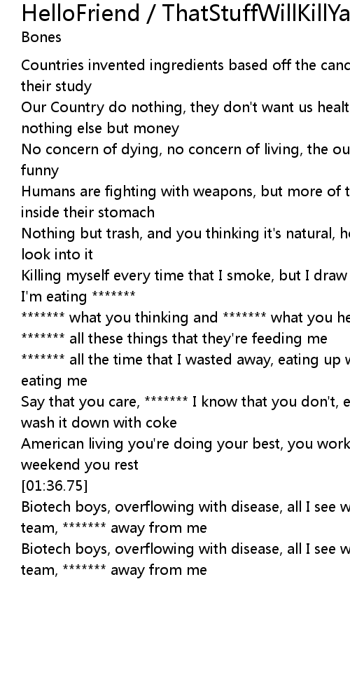 | [01:29.05] | Say that you care, ******* I know that you don't, eat up the burger wash it down with coke |