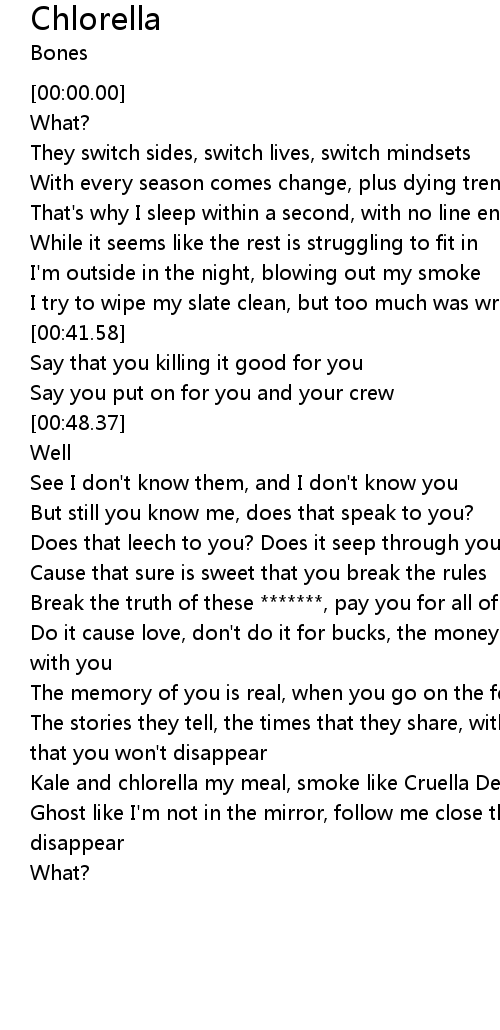 | [01:15.20] | Kale and chlorella my meal, smoke like Cruella De Vil |