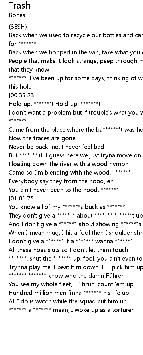 | [00:17.97] | Back when we used to recycle our bottles and cans, just to get money for ******* |