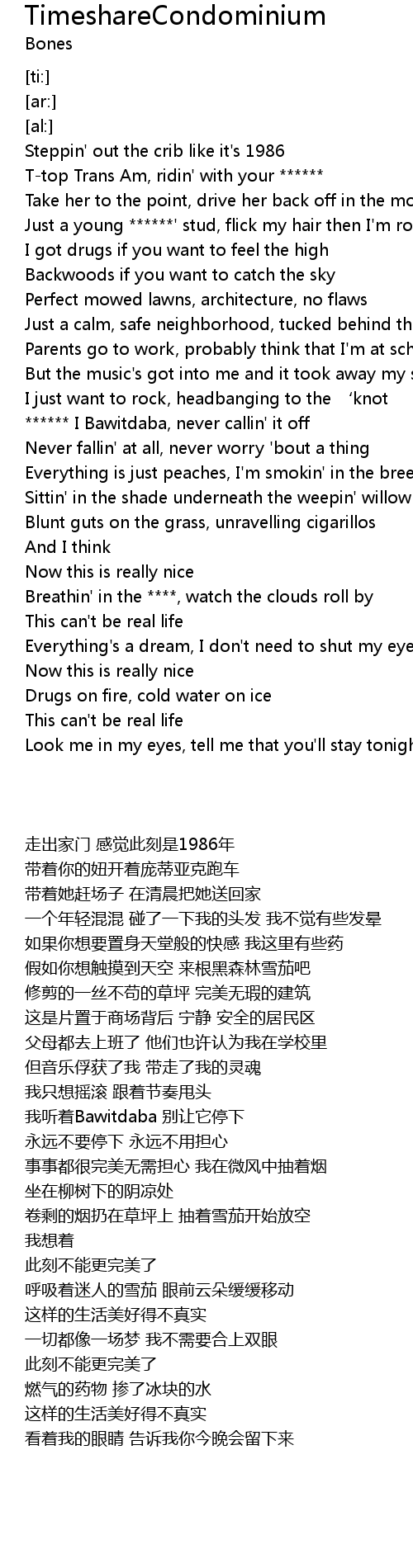 | [00:04.38] | T-top Trans Am, ridin' with your ****** |