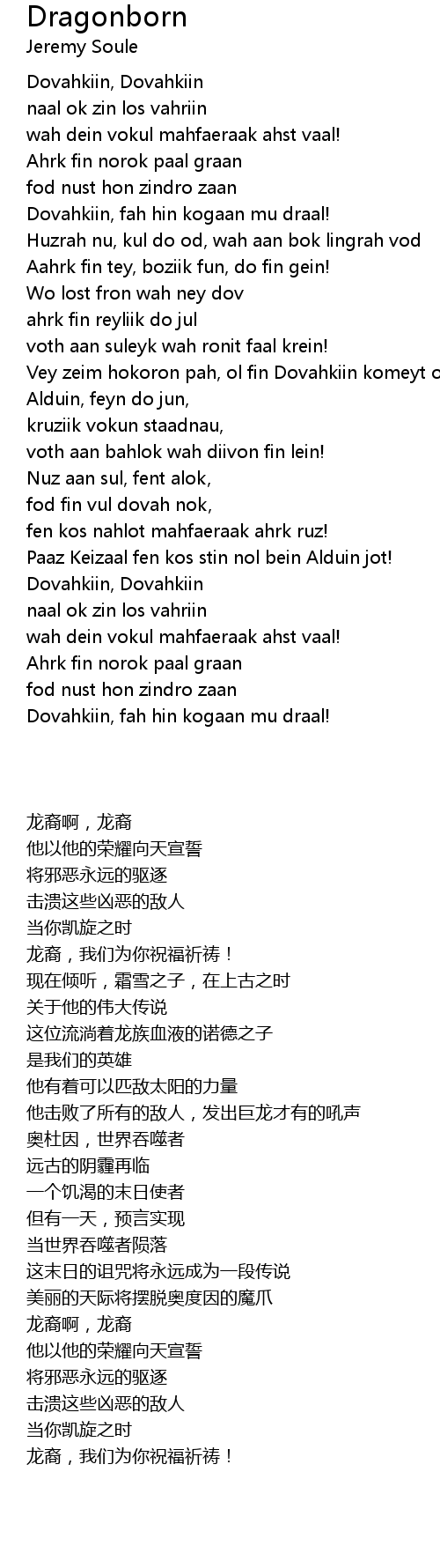 Vey zeim hokoron pah, ol fin Dovahkiin komeyt ok rein! |