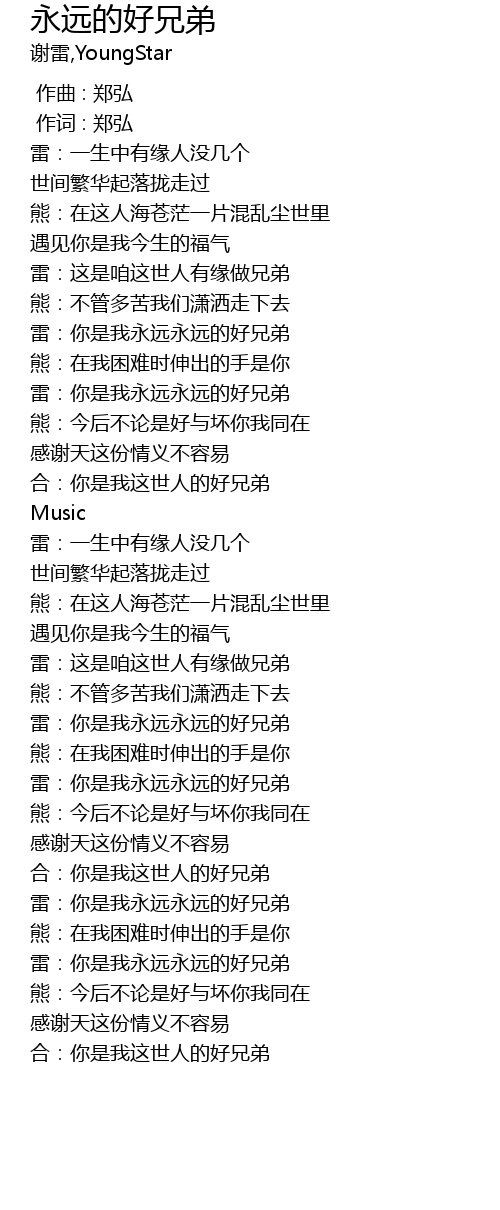 | [01:14.89] | léi: nǐ shì wǒ yǒng yuǎn yǒng yuǎn de hǎo xiōng dì |