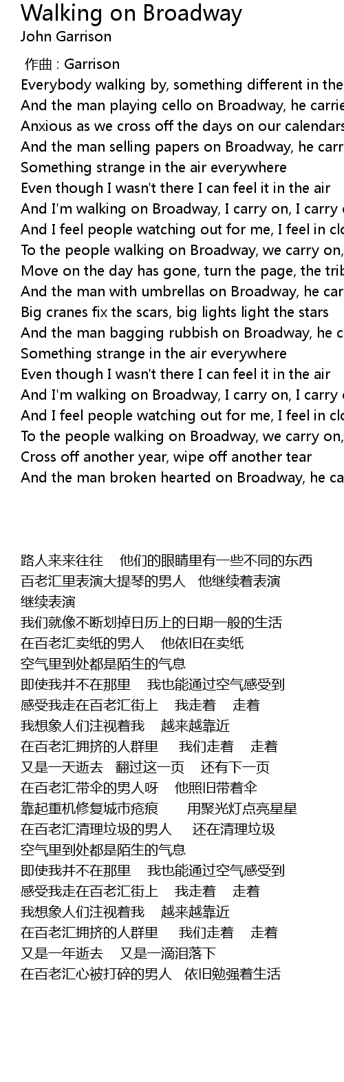 | [02:32.200] | And I' m walking on Broadway, I carry on, I carry on |