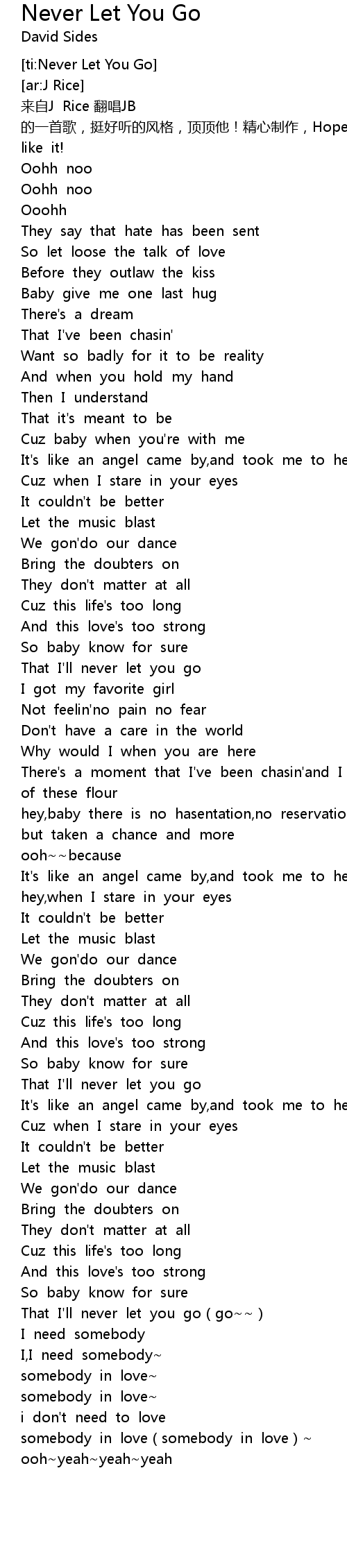 | [00:03.410] | 来自J Rice 翻唱JB 的一首歌,挺好听的风格,顶顶他!精心制作,Hope you will like it! |