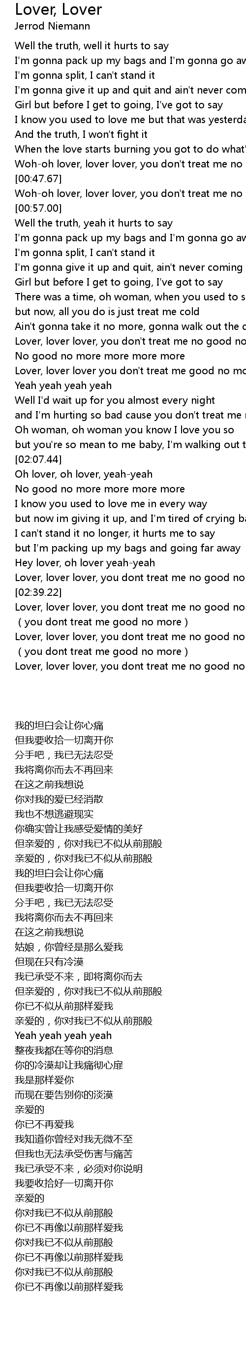 | [00:50.09] | Woh-oh lover, lover lover, you don't treat me no good no more |