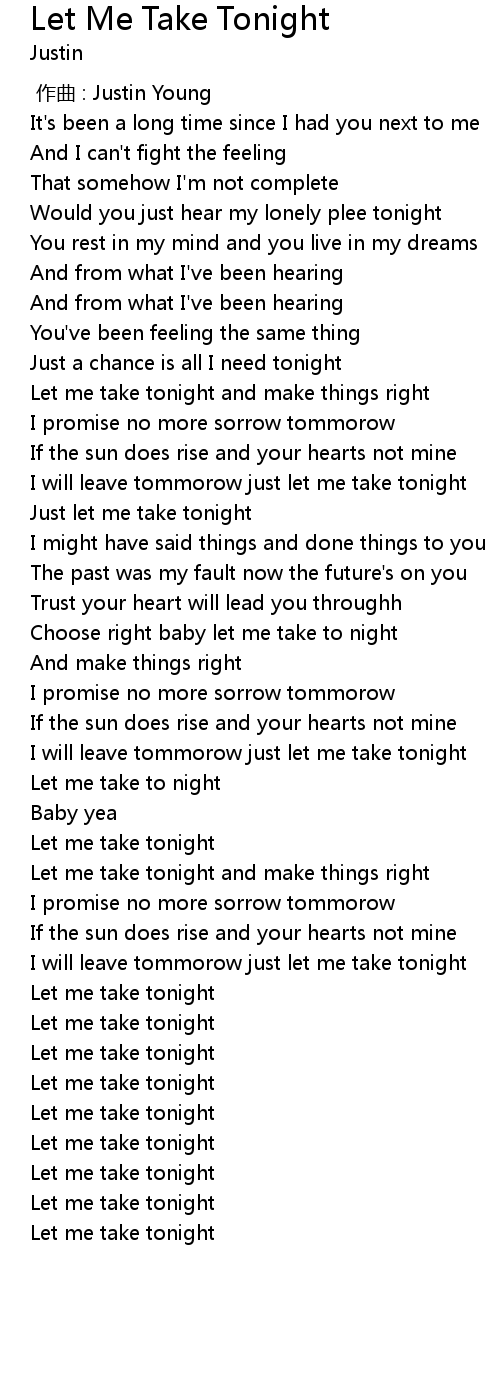| [02:13.17] | I will leave tommorow just let me take tonight |