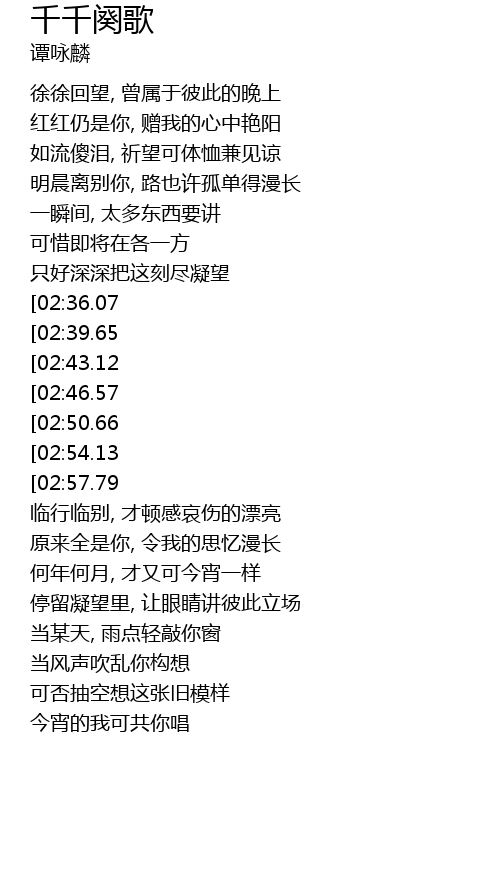 | [01:11.58][02:36.07][03:32.21] | lái rì zòng shì qiān qiān què gē |