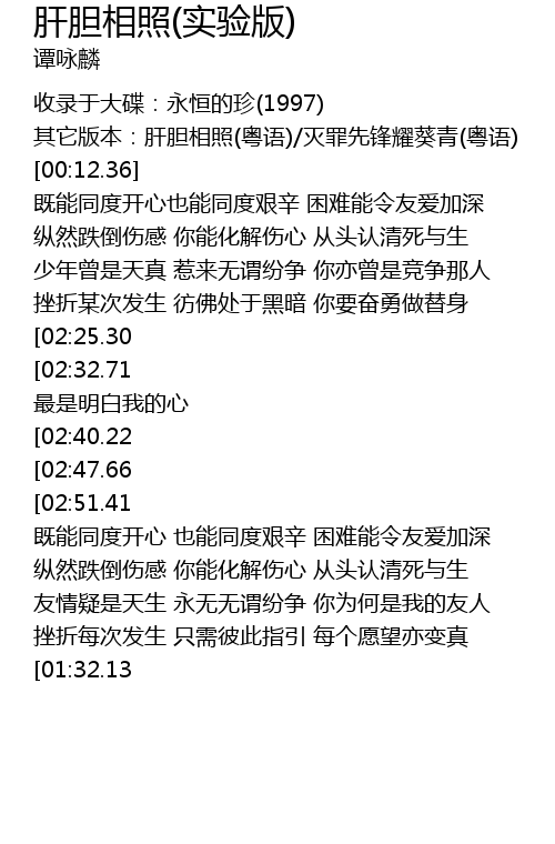 | [00:10.31] | 其它版本:肝胆相照(粤语)/灭罪先锋耀葵青(粤语) |