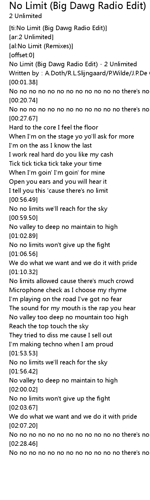 | [00:00.02] | No Limit (Big Dawg Radio Edit) - 2 Unlimited |
