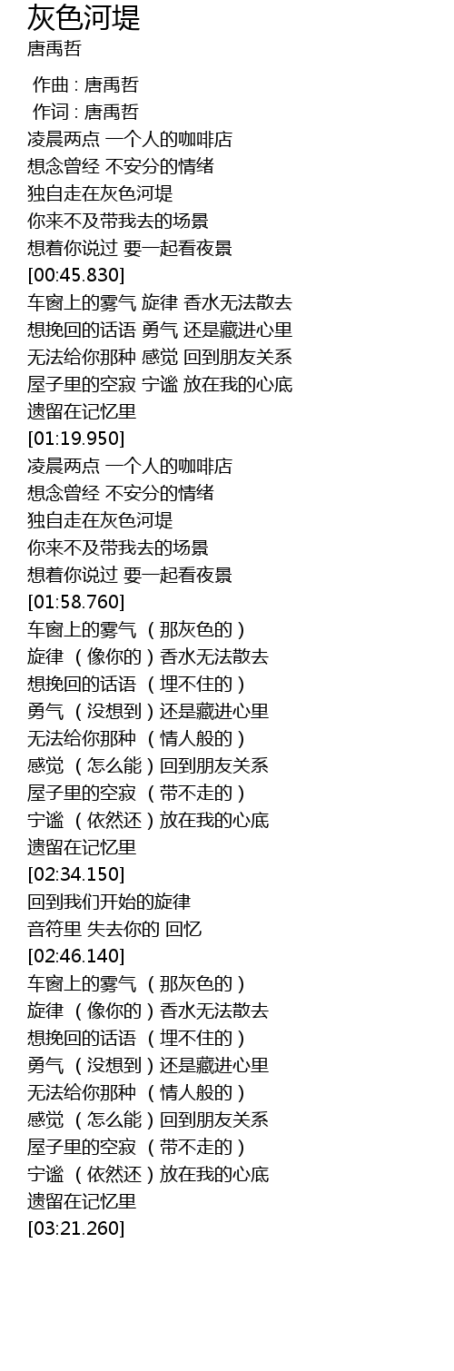 | [00:32.340] | 独自走在灰色河堤 |