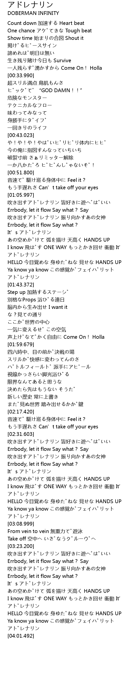 | [03:01.308] | HELLO 今目覚めな 身ゆだねな 見せな HANDS UP |