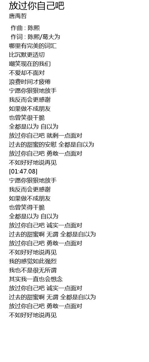 | [01:13.09] | 放过你自己吧 就剩一点面对 |