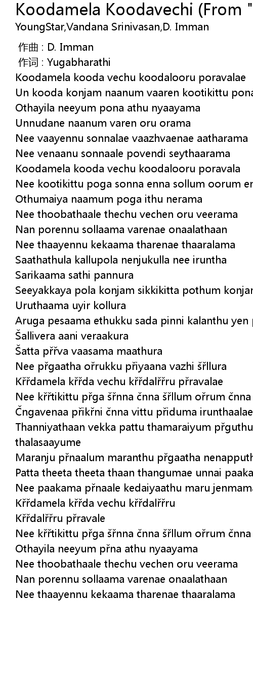 | [00:56.70] | Koodamela kooda vechu koodalooru poravala |