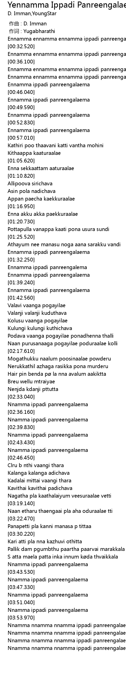 | [00:33.160] | Ennamma ennamma ennamma ippadi panreengalaema |