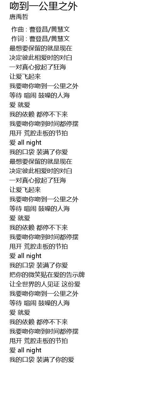 | [00:45.40] | 我要吻你吻到一公里之外 |