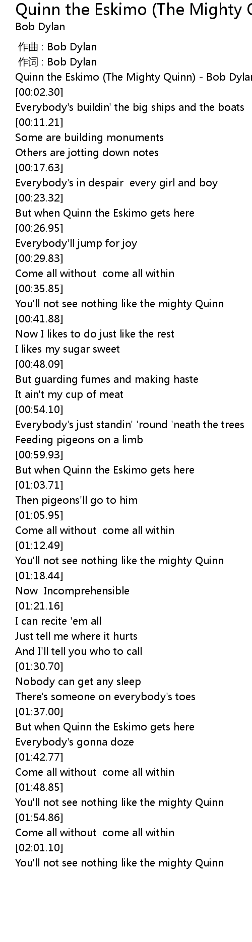 | [01:37.60] | But when Quinn the Eskimo gets here |