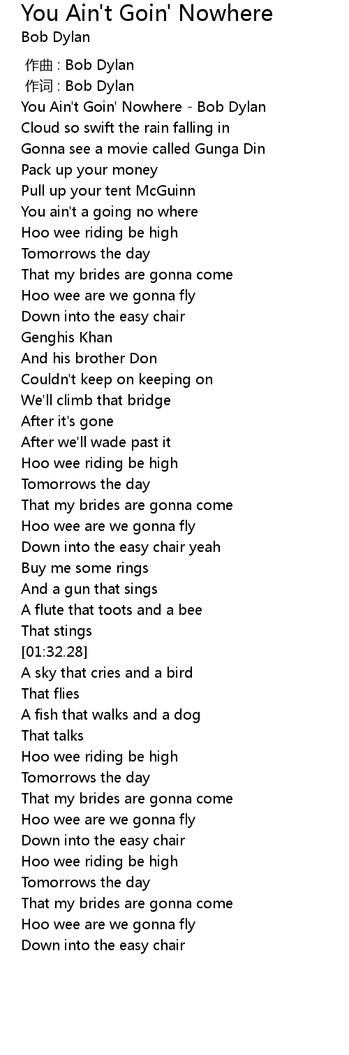 | [00:01.07] | You Ain' t Goin' Nowhere Bob Dylan |