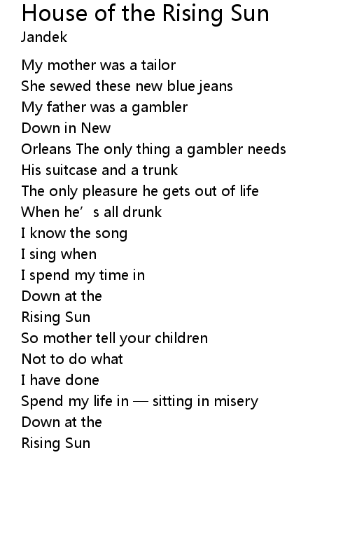| Song | House of the Rising Sun |