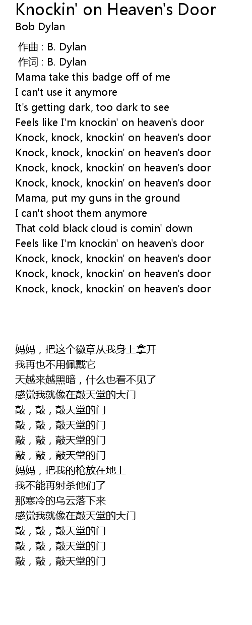 | [01:58.18] | Knock, knock, knockin' on heaven's door |
