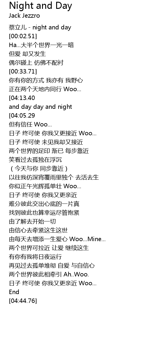 | [04:27.34][04:13.40][03:59.74][03:45.89][03:31.87][01:58.60][01:44.65][01:03.61][00:49.49] | night and day day and night |