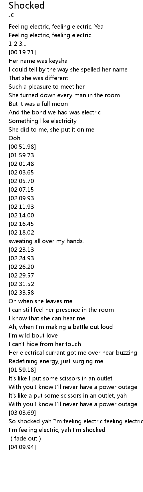 | [03:50.15] | I'm feeling electric, yah I'm shocked |
