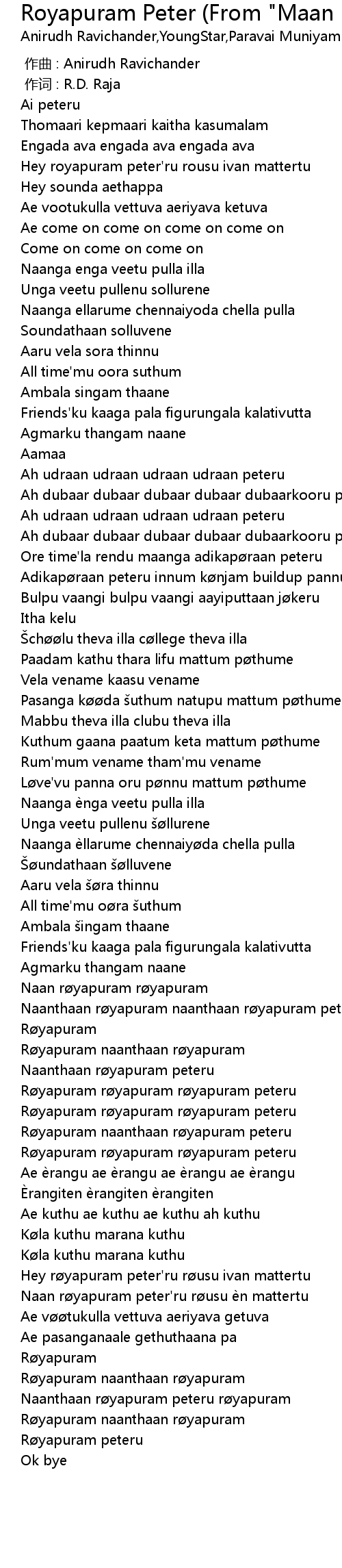 | [03:05.73] | Naan røyapuram peter'ru røusu èn mattertu |