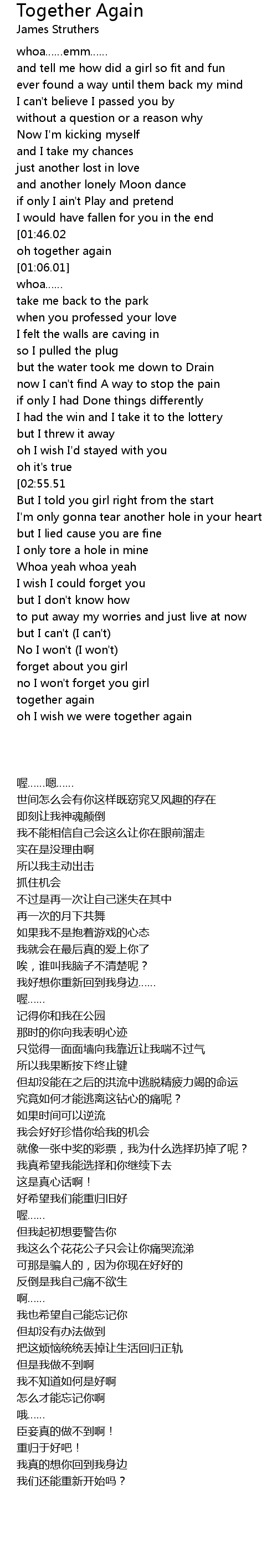 | [00:48.72][01:46.02][03:04.44] | I wish we were together again |