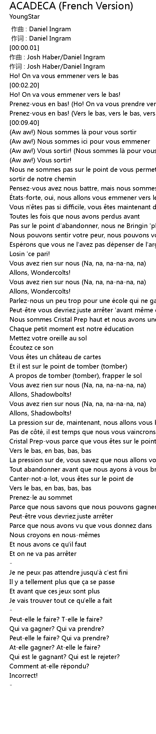 | [00:07.70] | Prenez-vous en bas! (Vers le bas, vers le bas, vers le bas) |