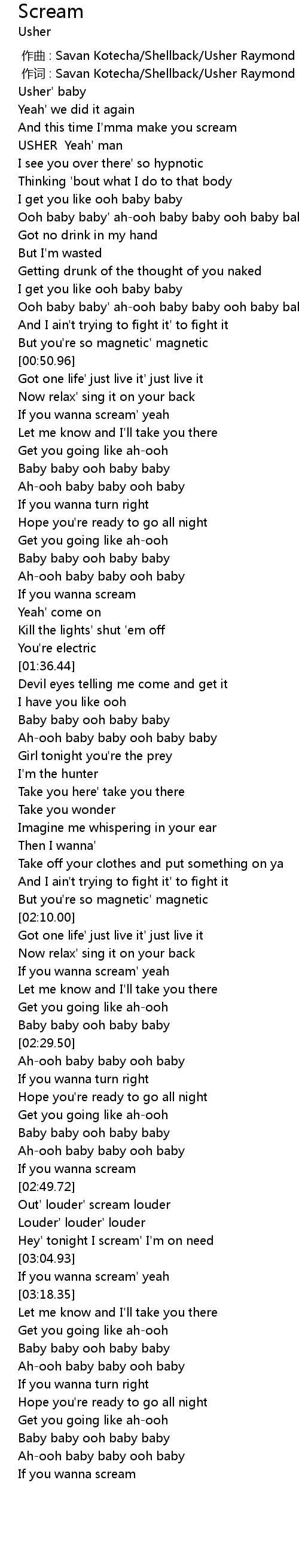 | [00:01.00] | zuò cí : Savan Kotecha Shellback Usher Raymond IV Max Martin |