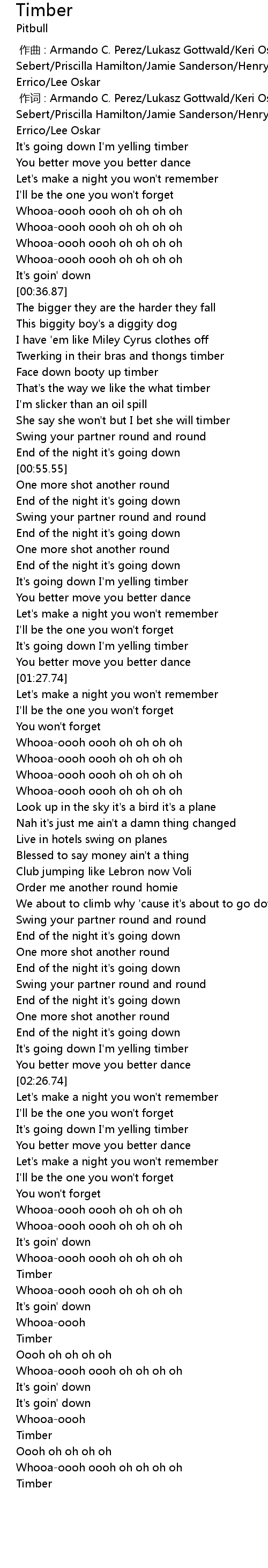 | [00:43.28] | Twerking in their bras and thongs timber |