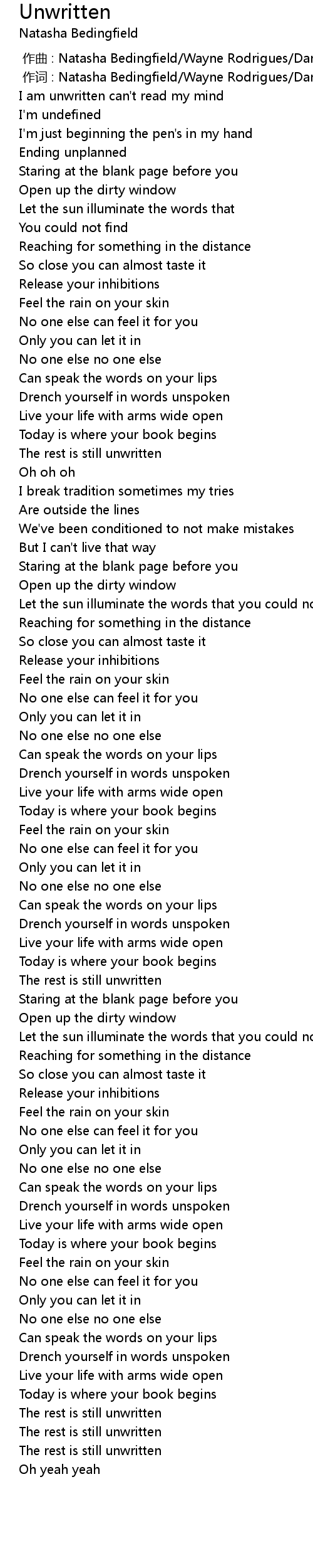 | [00:01.00] | 作词 : Natasha Bedingfield/Wayne Rodrigues/Danielle Brisebois |