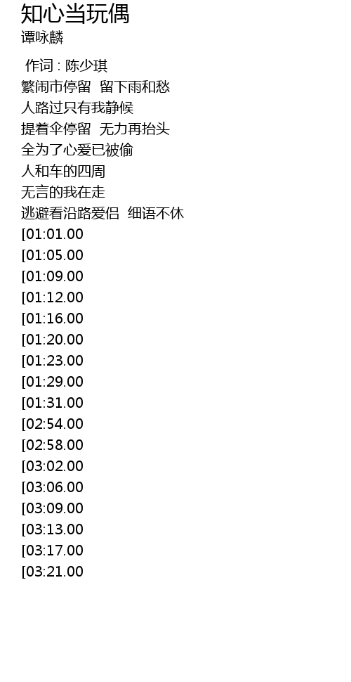 | [03:28.00][02:58.00][01:38.00] | 轻将我真心当玩偶 |