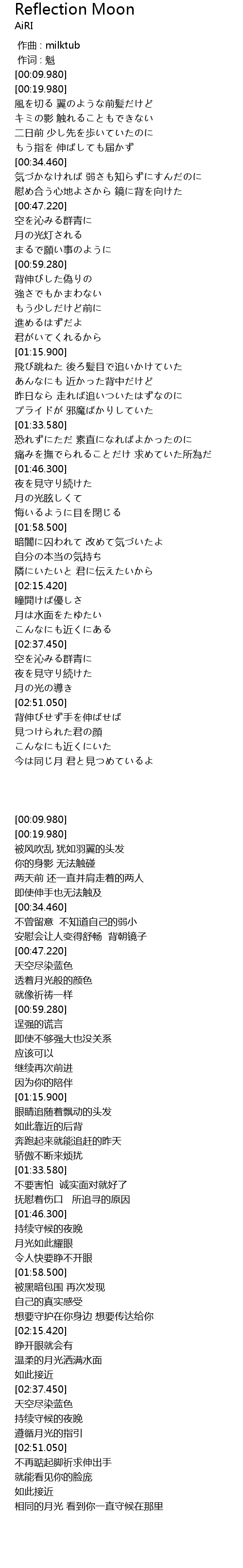 | [03:02.480] | 今は同じ月 君と見つめているよ |