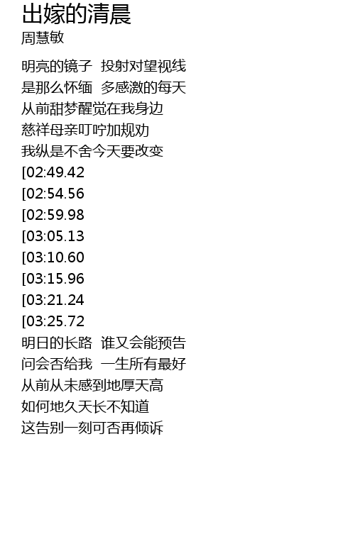 | [03:50.05][02:49.42][01:18.15] | 来到这出嫁的清晨 |