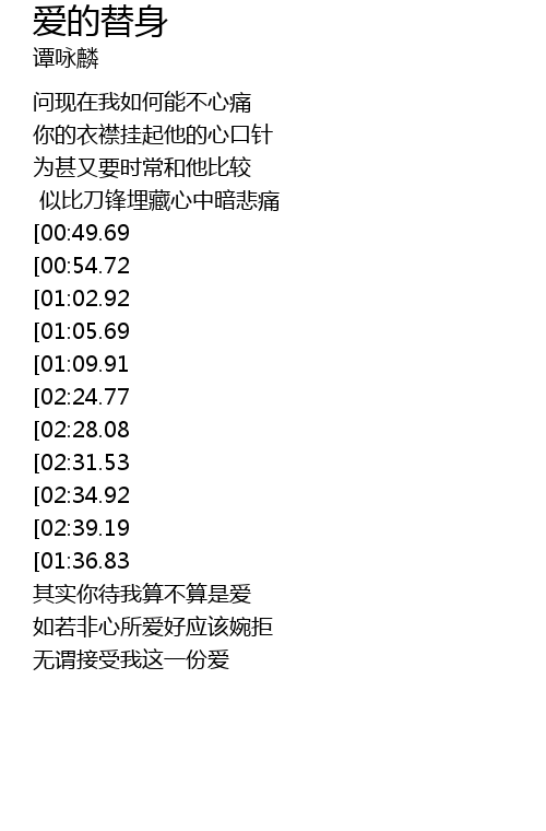 | [02:18.64][01:09.91] | 让我代当天失去的爱 |
