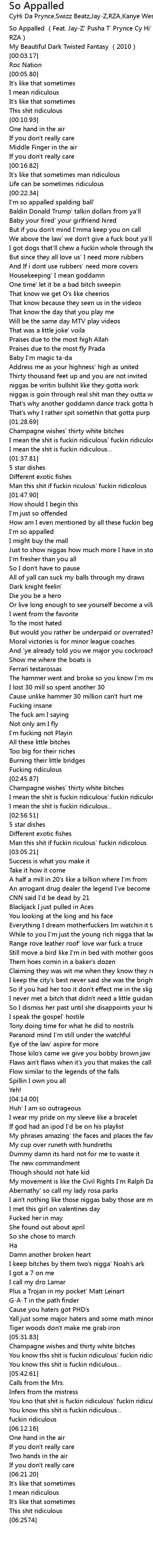 | [00:00.00] | So Appalled Feat. JayZ' Pusha T' Prynce Cy Hi' Swizz Beatz The RZA |