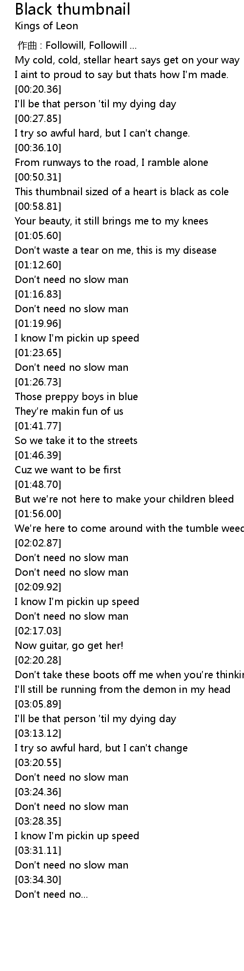| [03:32.61] | Don′t need no slow man |