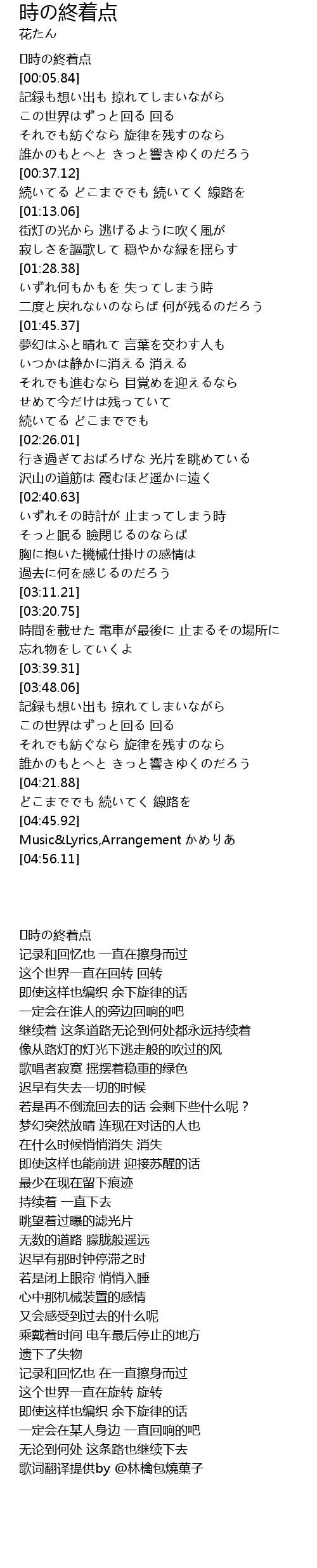 | [03:21.56] | shí jiān zài diàn chē zuì hòu zhǐ chǎng suǒ |