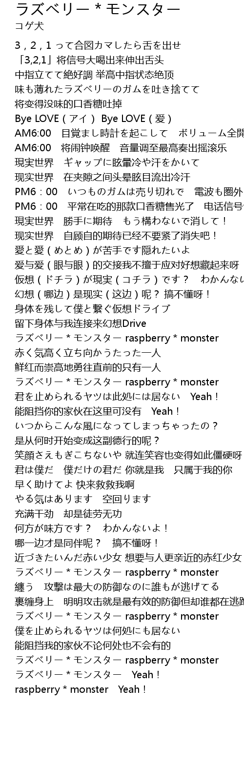 | [02:31.96] | ラズベリー*モンスター Yeah! raspberry*monster Yeah! |