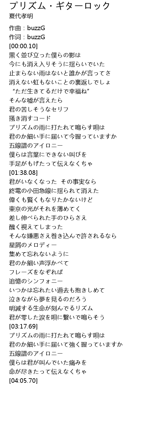 | [01:09.53] | プリズムの雨に打たれて鳴らす唄は |