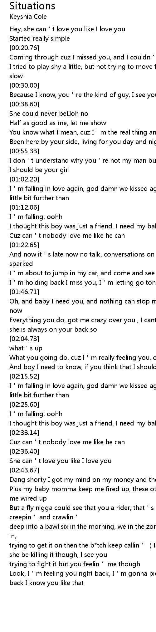 | [00:12.34] | Hey, she can t love you like I love you |