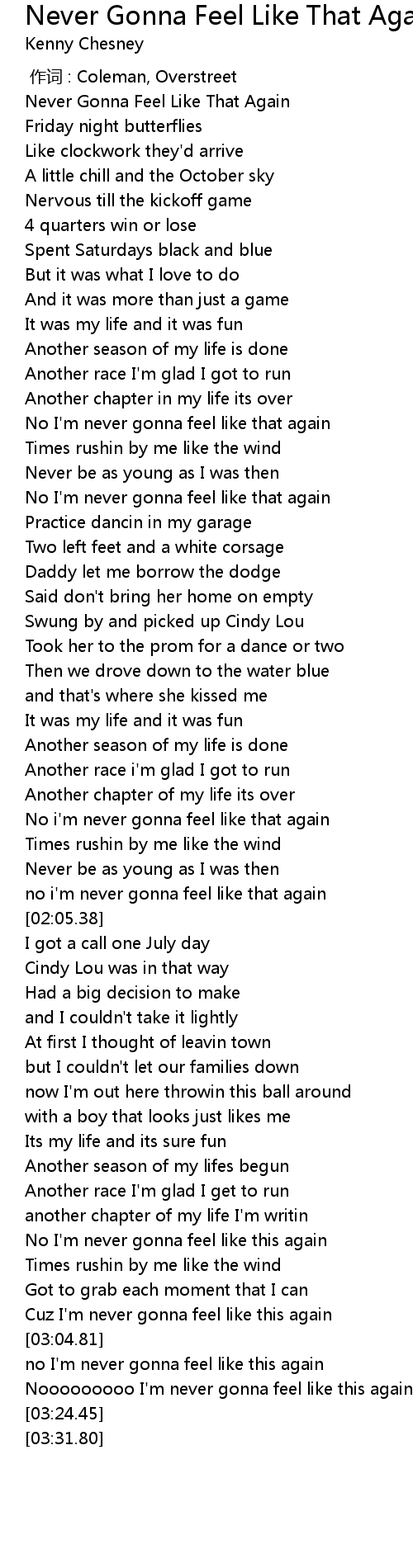 | [00:02.11] | Never Gonna Feel Like That Again |