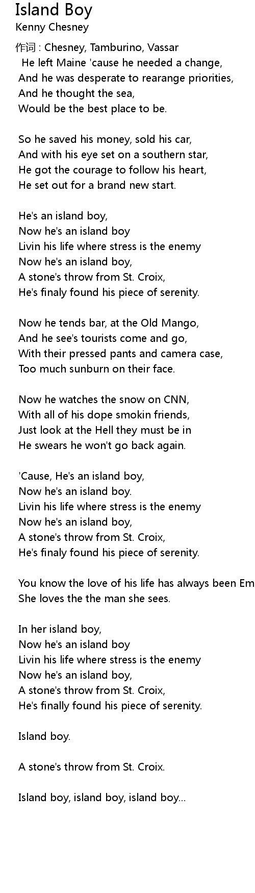 | 'Cause, He's an island boy, | |