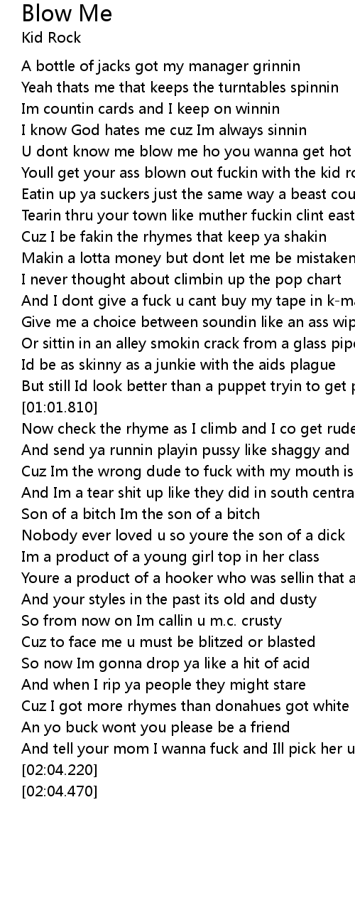 | [02:00.600] | And tell your mom I wanna fuck and Ill pick her up at 10 |