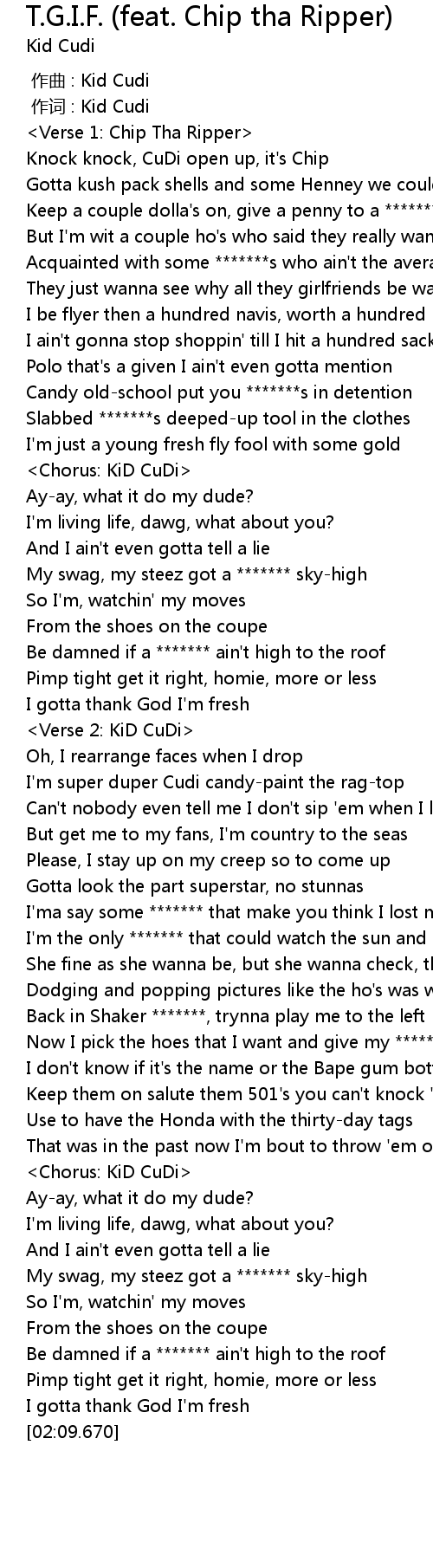 | [00:44.580] | My swag, my steez got a ******* sky-high |