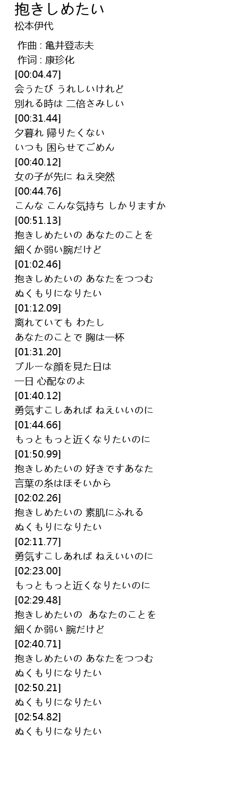 | [02:41.31] | 抱きしめたいの あなたをつつむ |