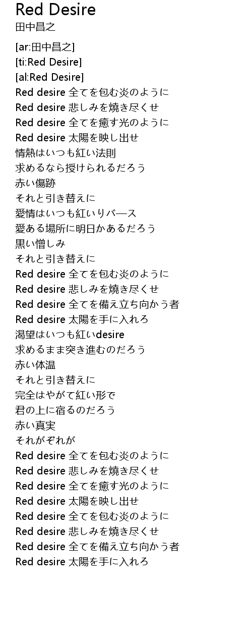| [00:18.74] | Red desire 全てを包む炎のように |