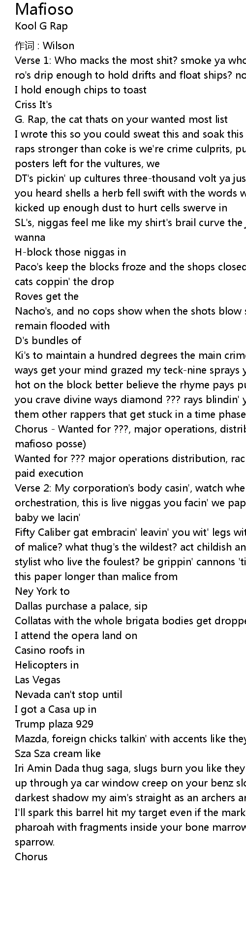 | Chorus - Wanted for ???, major operations, distribution (G. Rap is down with a mafioso posse) | |