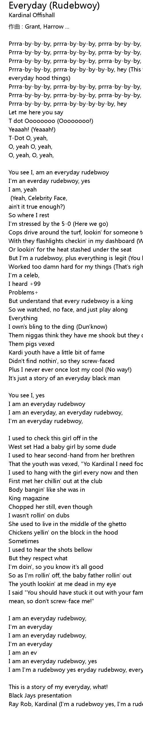 | You see I, am an everyday rudebwoy Kardinal Offishall Yeah, Celebrity Face, ain' t it true enough? | |